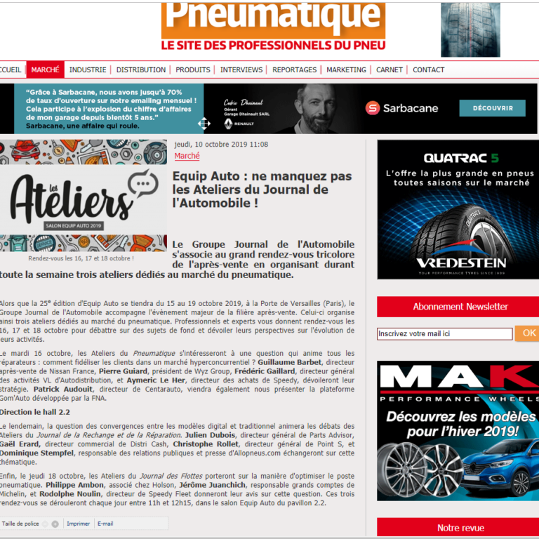 Le Groupe Journal de l’Automobile s’associe au grand rendez-vous tricolore de l’après-vente en organisant durant toute la semaine trois ateliers dédiés au marché du pneumatique. Le mercredi 16 octobre, les Ateliers du Pneumatique s’intéresseront à une question qui anime tous les réparateurs : comment fidéliser les clients dans un marché hyperconcurrentiel ? Guillaume Barbet, directeur après-vente de…